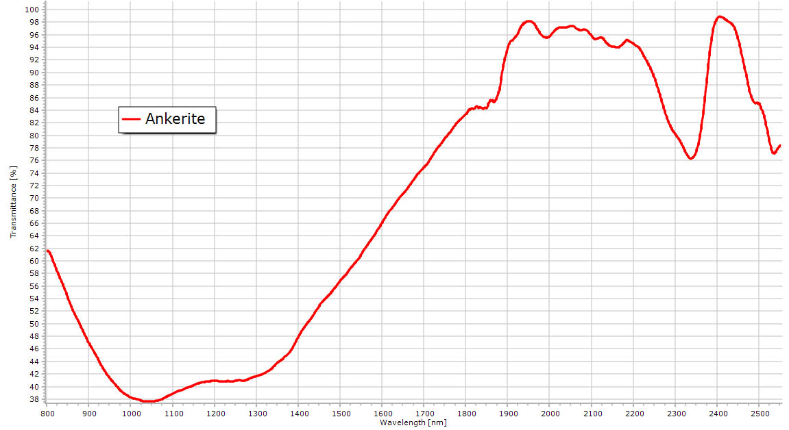 | In the ankerite spectrum, the 2 peaks of the carbonate are similar to calcite. In addition, iron 2 absorptions are visible at 1000-1300 cm-1 |