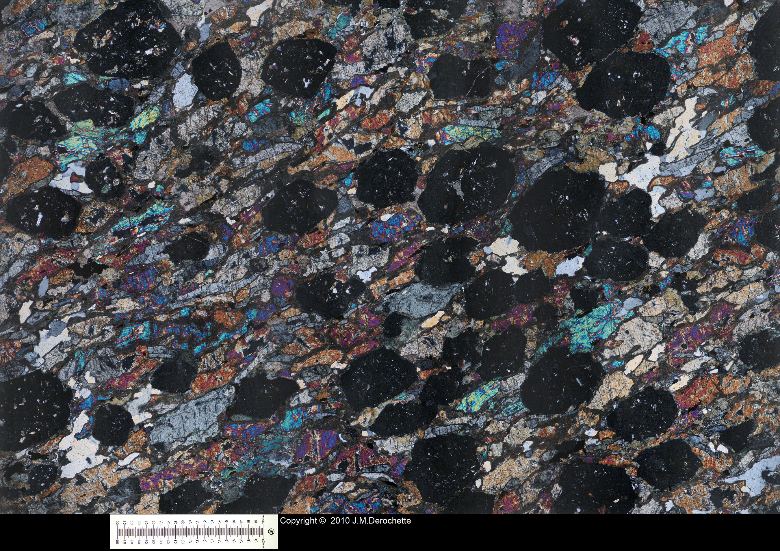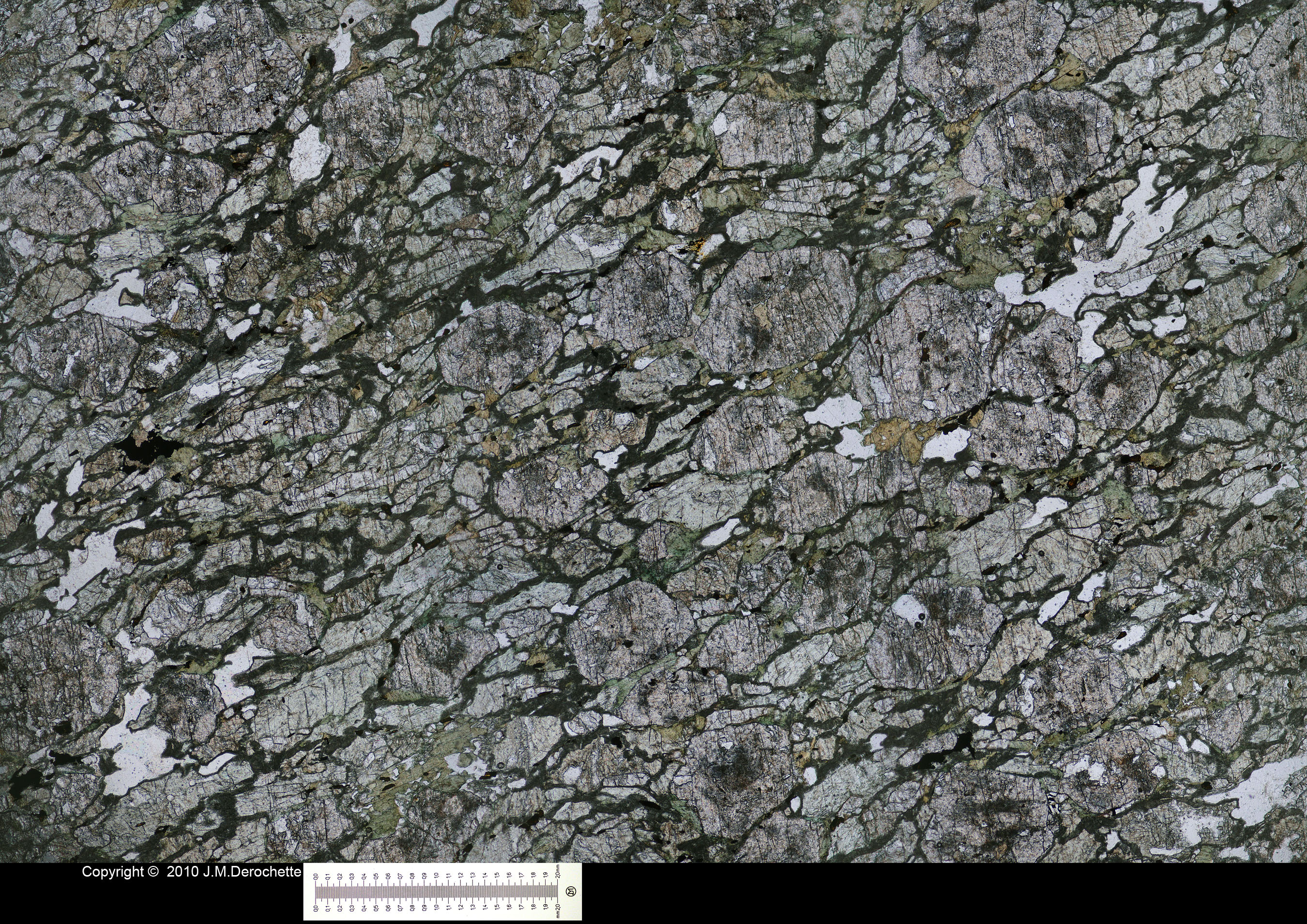 High pressure rock exhibiting large garnet phenocrysts and the pyroxene omphacite (green in plane polarized view). Some low relief quartz are also present.