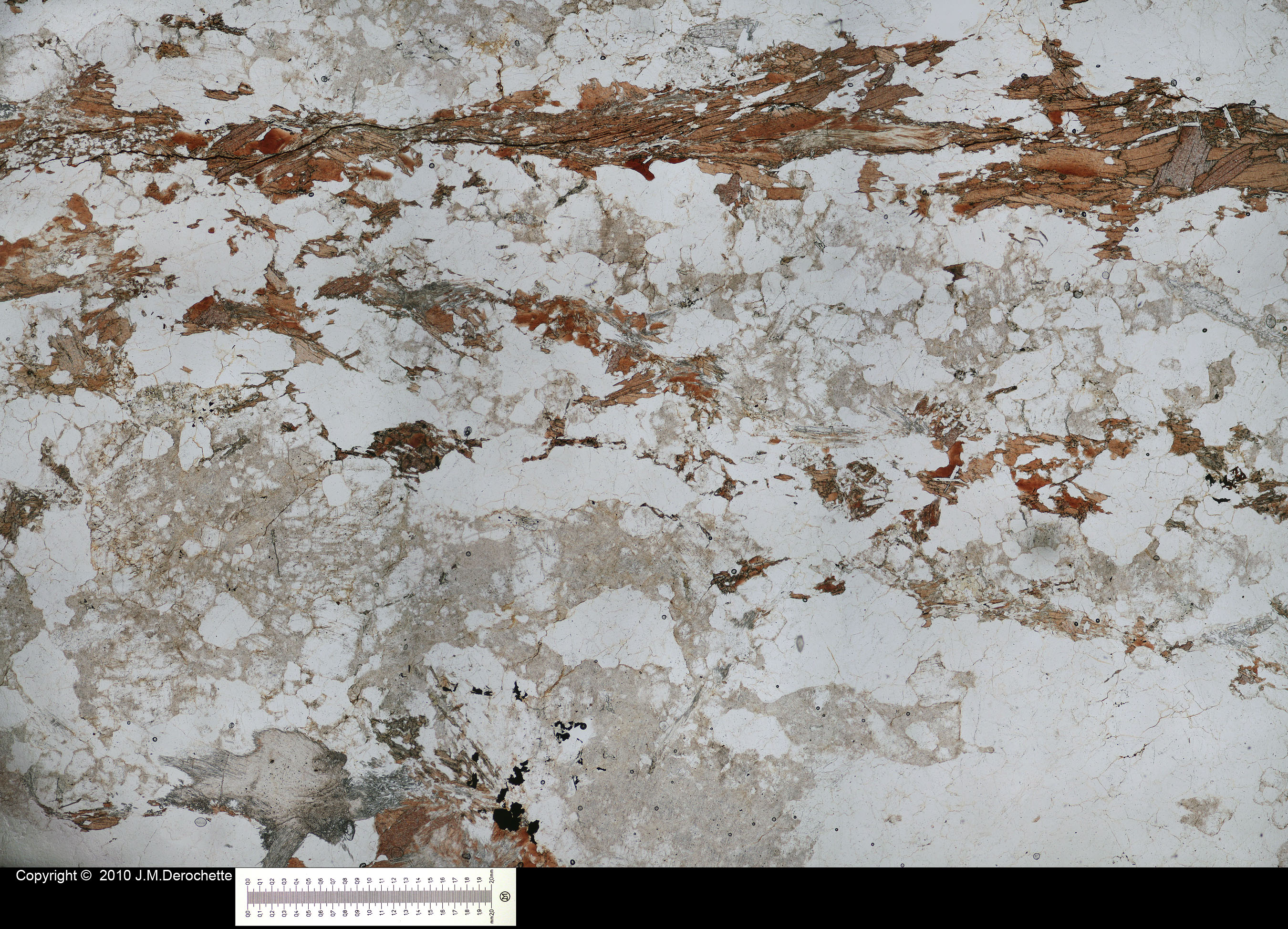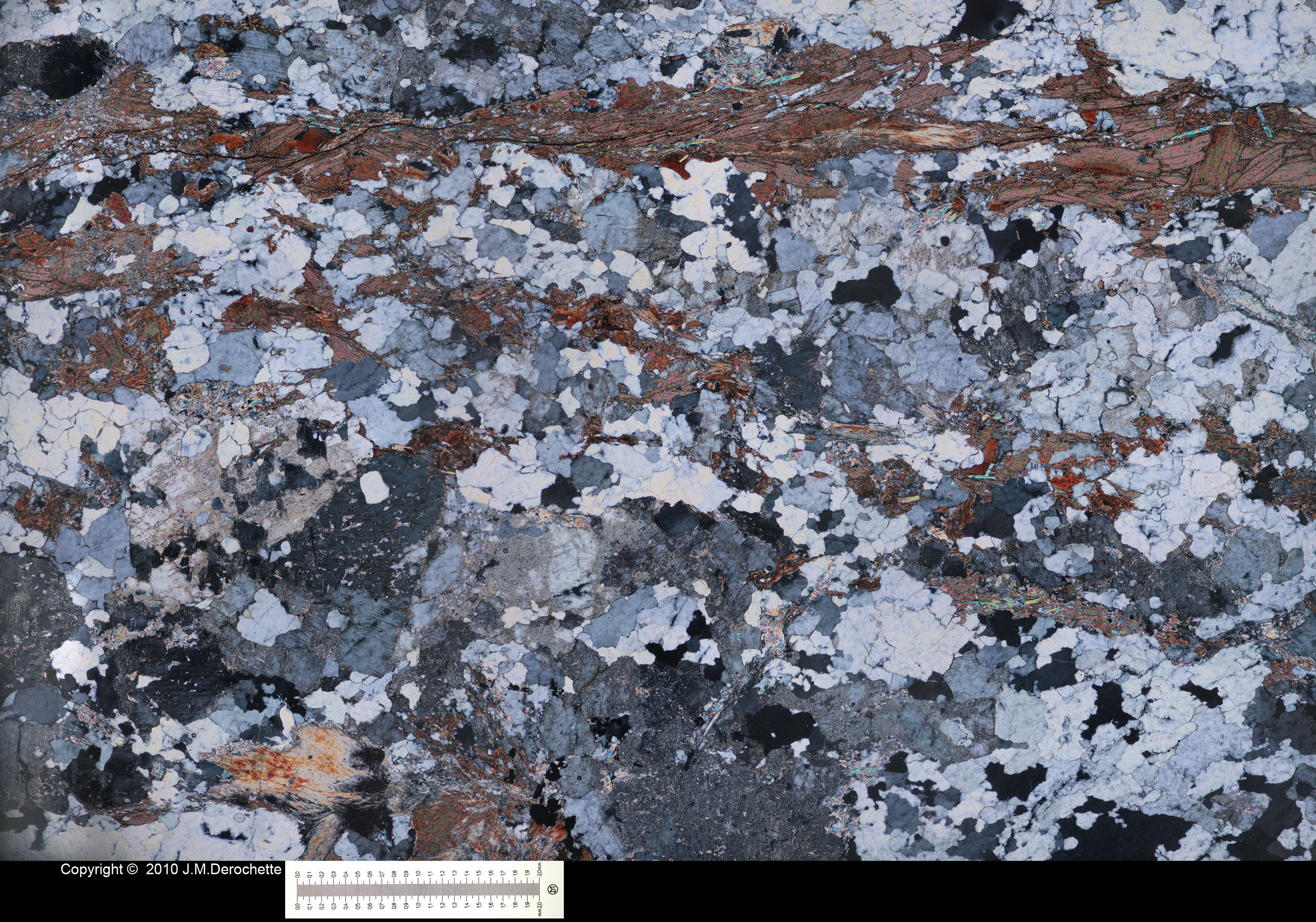 Gneiss with quartz and ribbons of biotite. Sillimanite is also present for example at the low left side of picture (aspect of flame in crossed polars view and high relief)