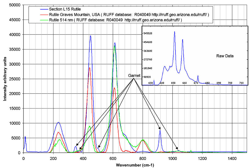 Rutile. The spectrum obtained is not a pure Rutile spectrum, some Garnet