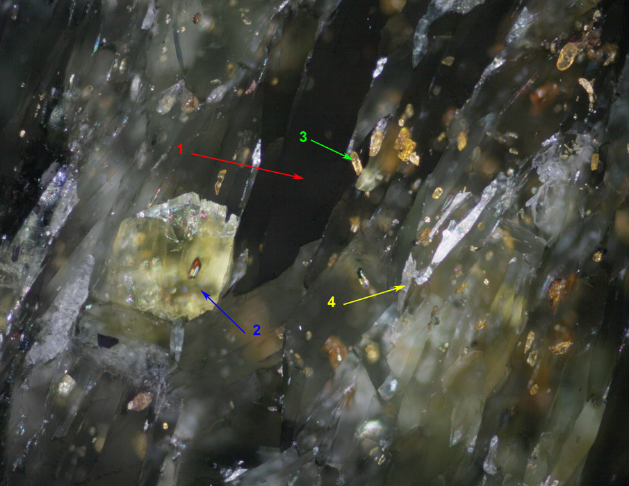 mica, 2 is epidote (see spectrum above), 3 is rutile (spectrum on