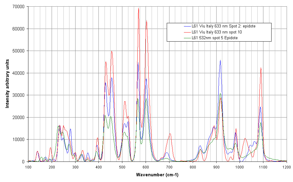 Three different spectra of epidote obtained with green and red lasers.