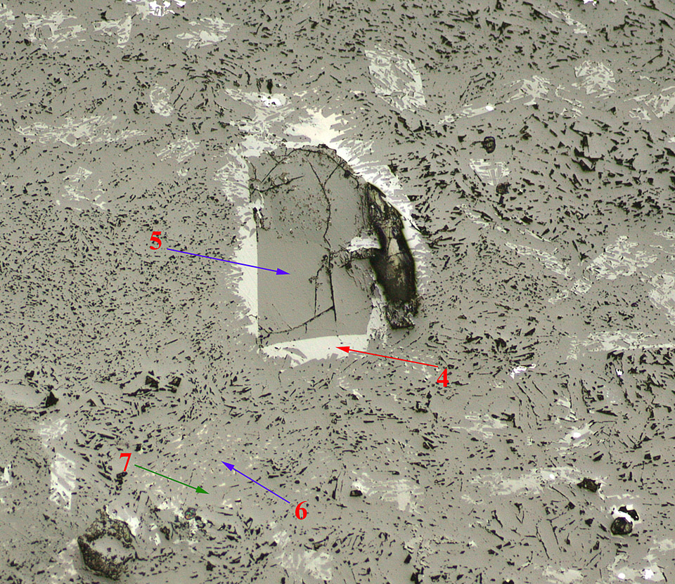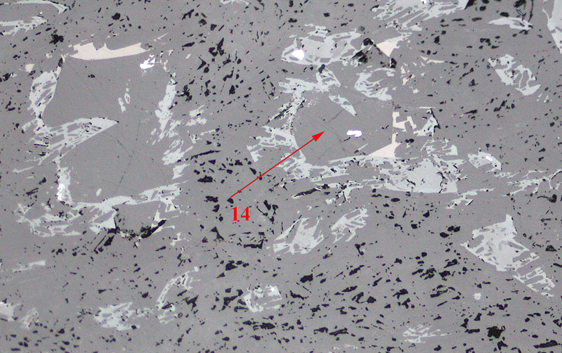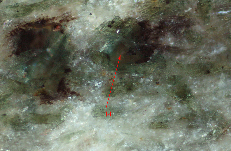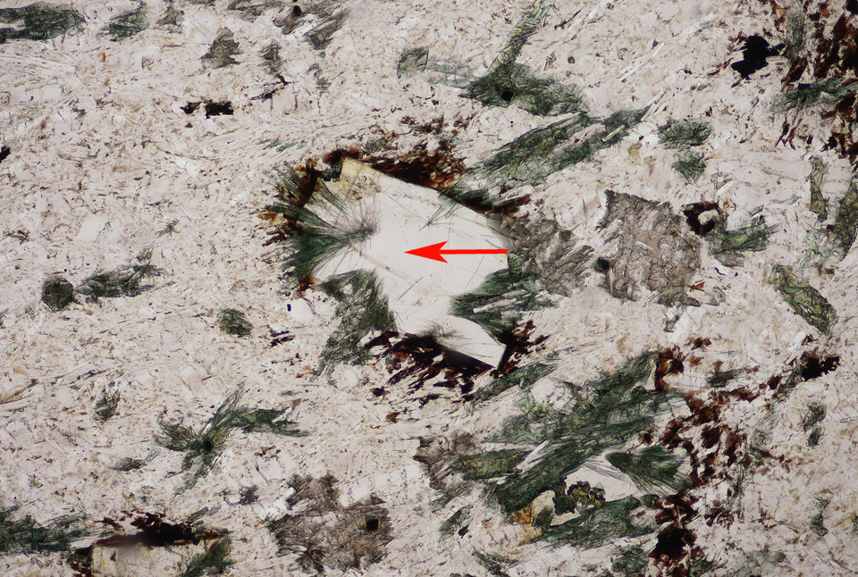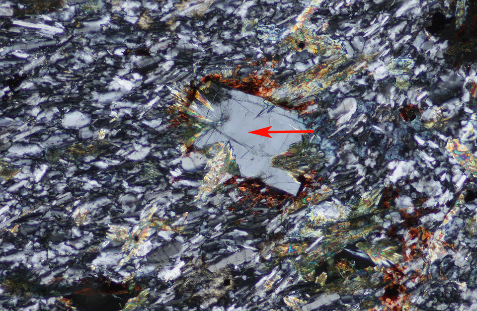 a crossed polars view. The arrow indicates a low birefringence nepheline