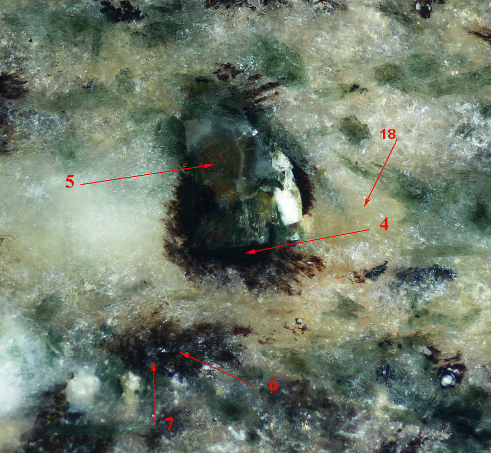 Aenigmatite is the dark brown mineral surrounding nepheline and sodalite