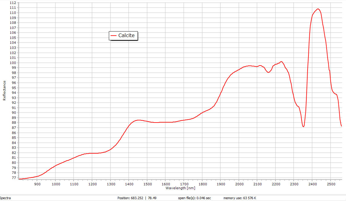 | NIR spectrum of calcite with the 2 absorptions of the carbonate ion at 2350 and 2550 nm. |
