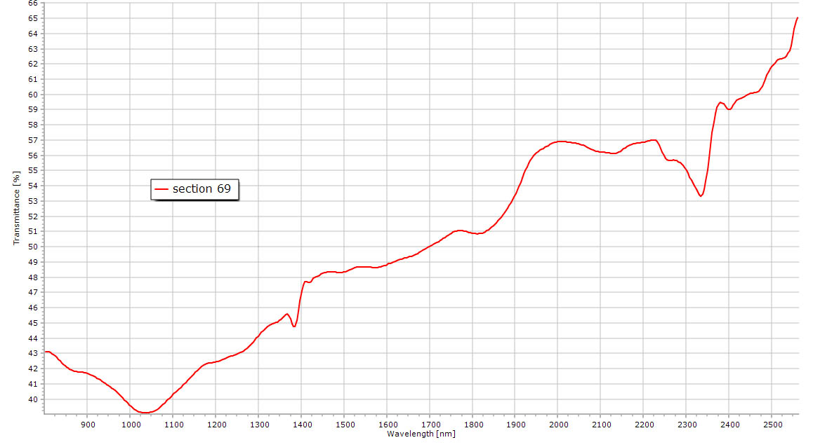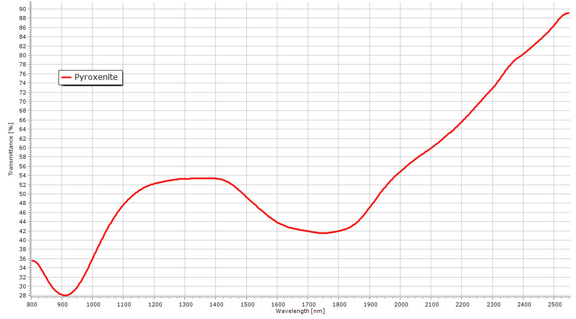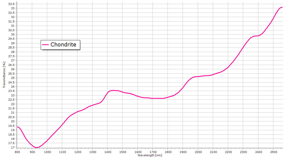 | NIR of a chondrite from Morocco. Ortho pyroxene can be seen in this spectrum from the peaks at 900 and 1800 nm. |