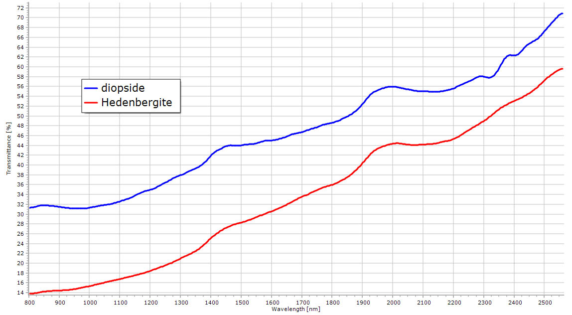 | Those diopside - hedenbergite spectra are poorly resolved due to the low concentration of iron in diopside and the too high concentration in hedenbergite which obscures the spectrum. |