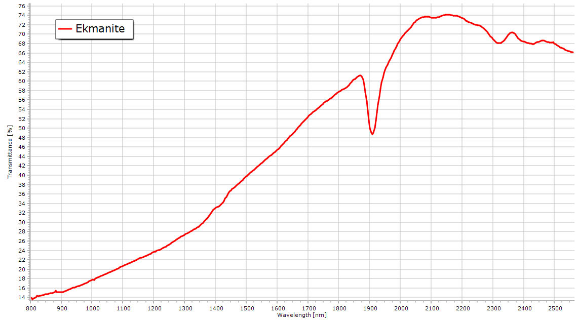 | The water present in the Ekmanite structure can be seen from this spectrum at 1900 nm. A small peak at 2325 nm can identify hydroxyl groups. |