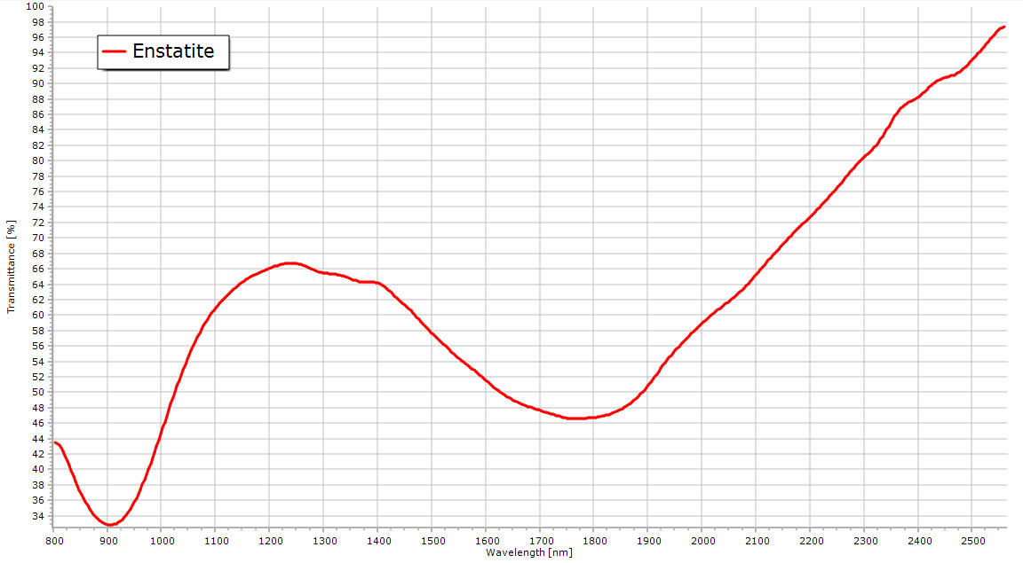 | Spectrum of enstatite showing the 2 crystal field absorptions of Fe++ at 900 and 1800 nm. This spectrum is characteristic of ortho pyroxene. |