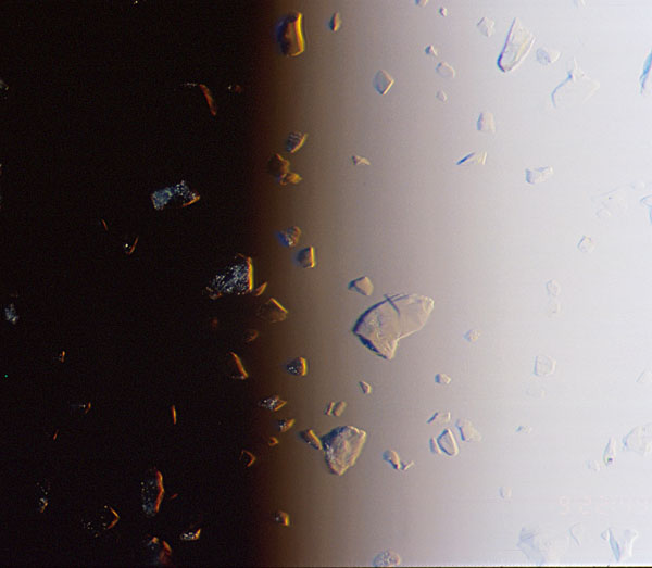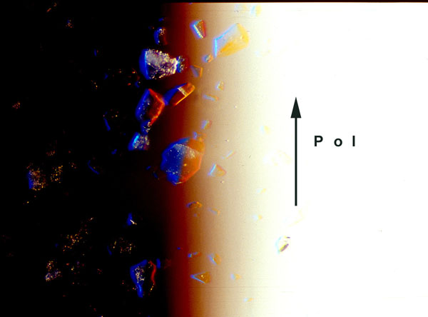 Central crystal has ordinary index parallel to polarizer and appears thus