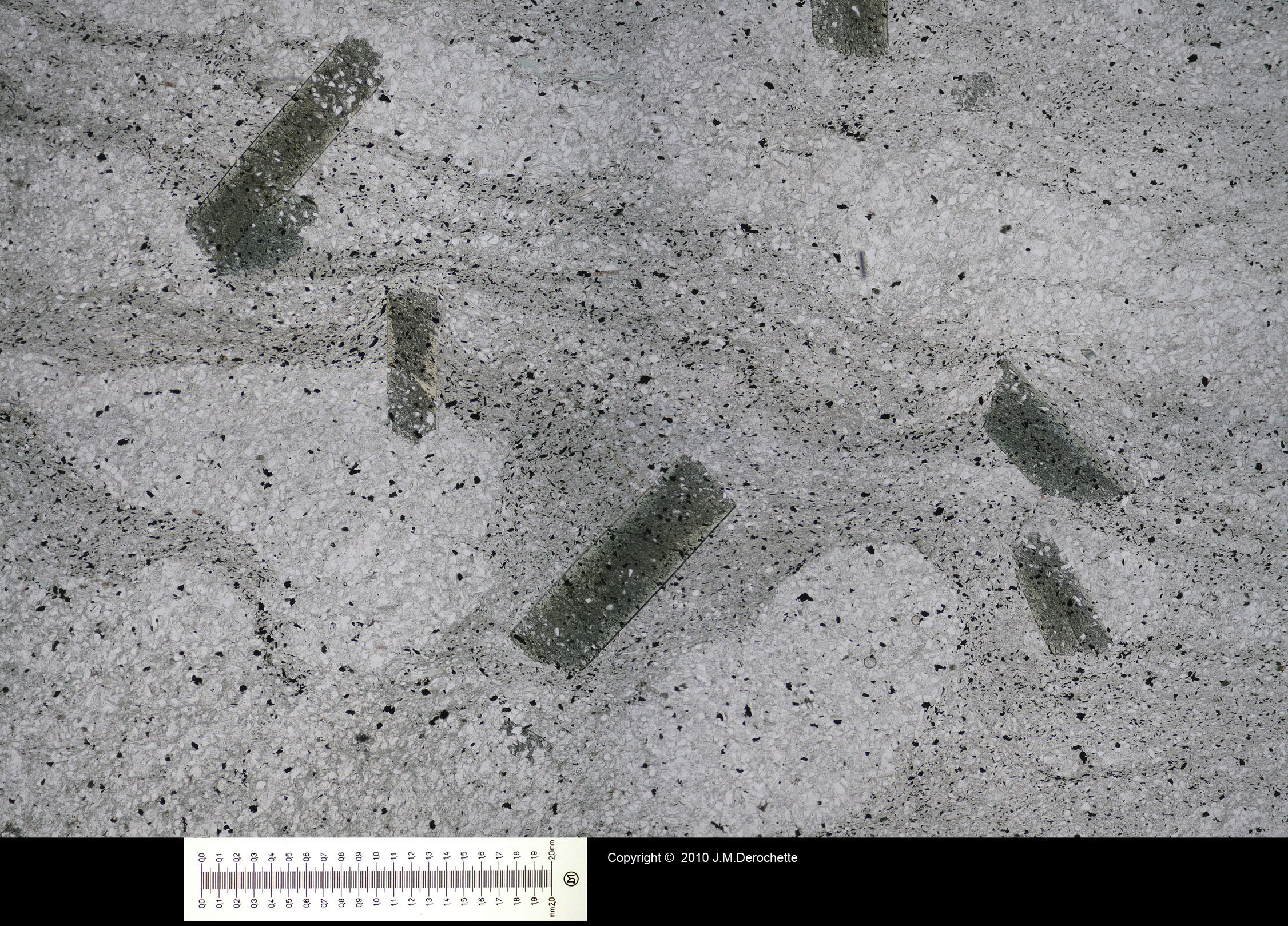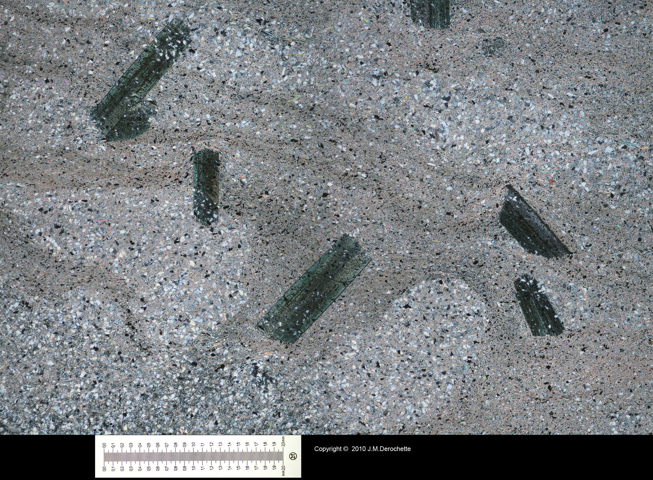 The view under crossed polars shows big crystals of chloritoid in a matrix of quartz and mica.