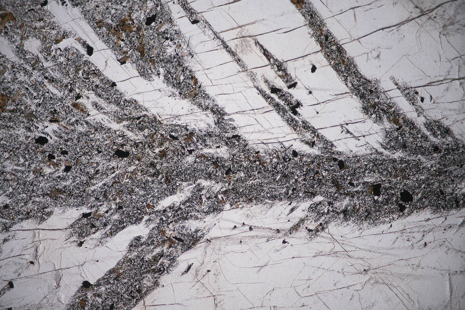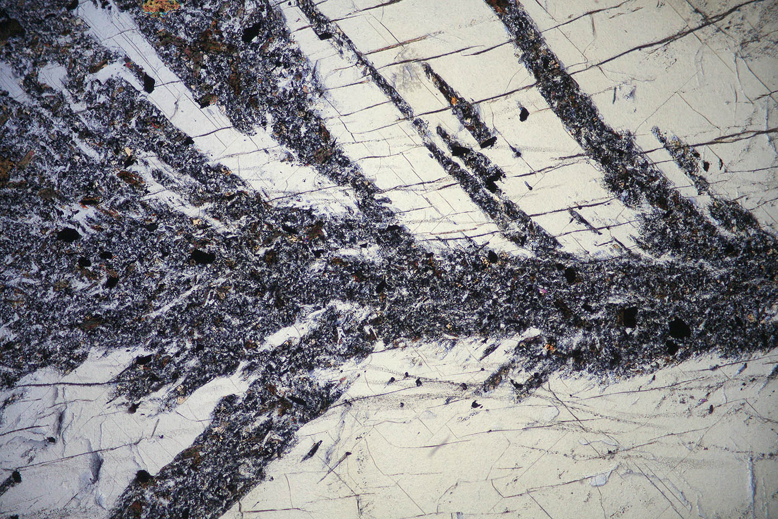 Details of the black cross of a chiastolite with some graphite, quartz, and biotite. The clear yellow crystal in the picture is andalusite.