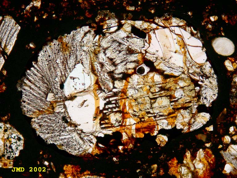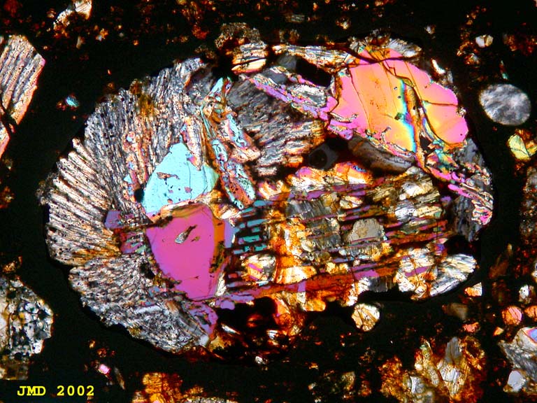 LPNA image. Radiating pyroxene blades (left part) + large olivine crystals (high birefringence colors) This elliptical chondrule seems to be the addition of a radial pyroxene chondrule to a porphyritic olivine pyroxene chondrule. Chondrule length is 1.1 mm.
