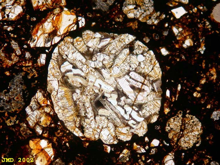 Olivine crystals clear with no cleavage in LPNA and High birefringence colors in LPA.