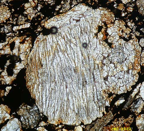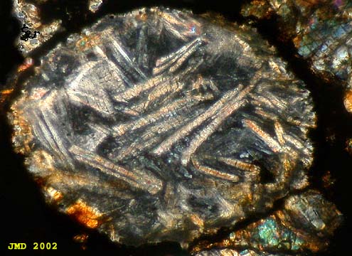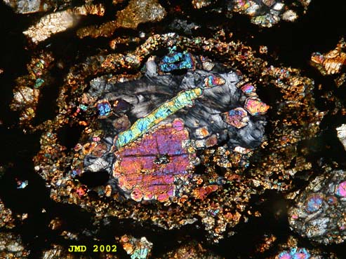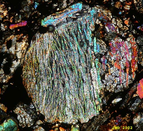 High color olivine laths alternating with low birefringence pyroxene crystals.