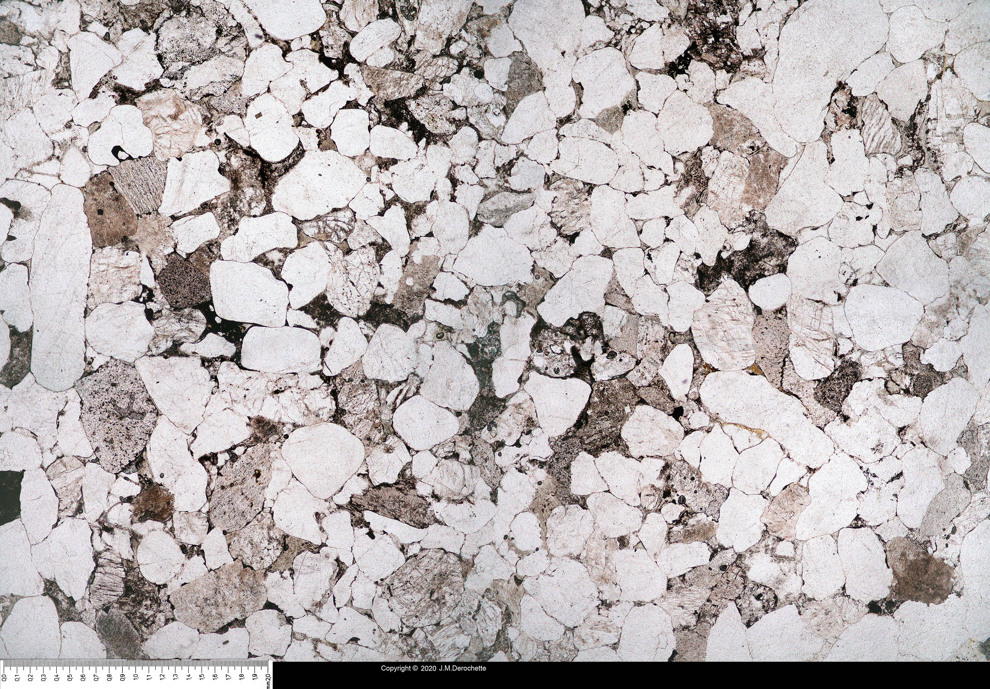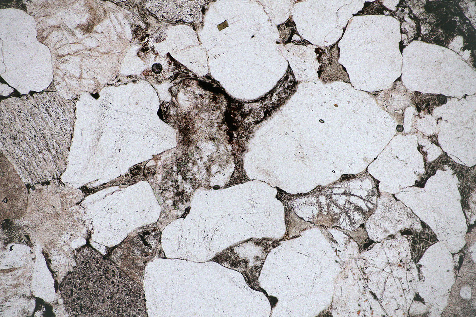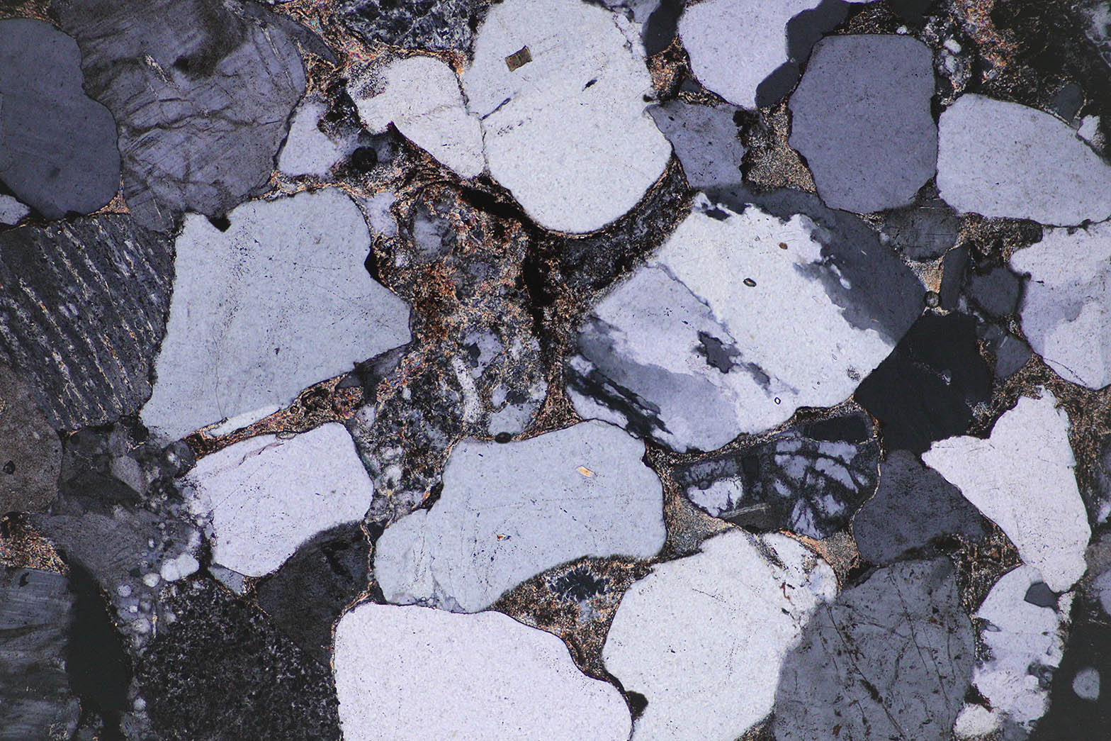 polarizers. Clear crystals are quartz, Feldspars are also visible