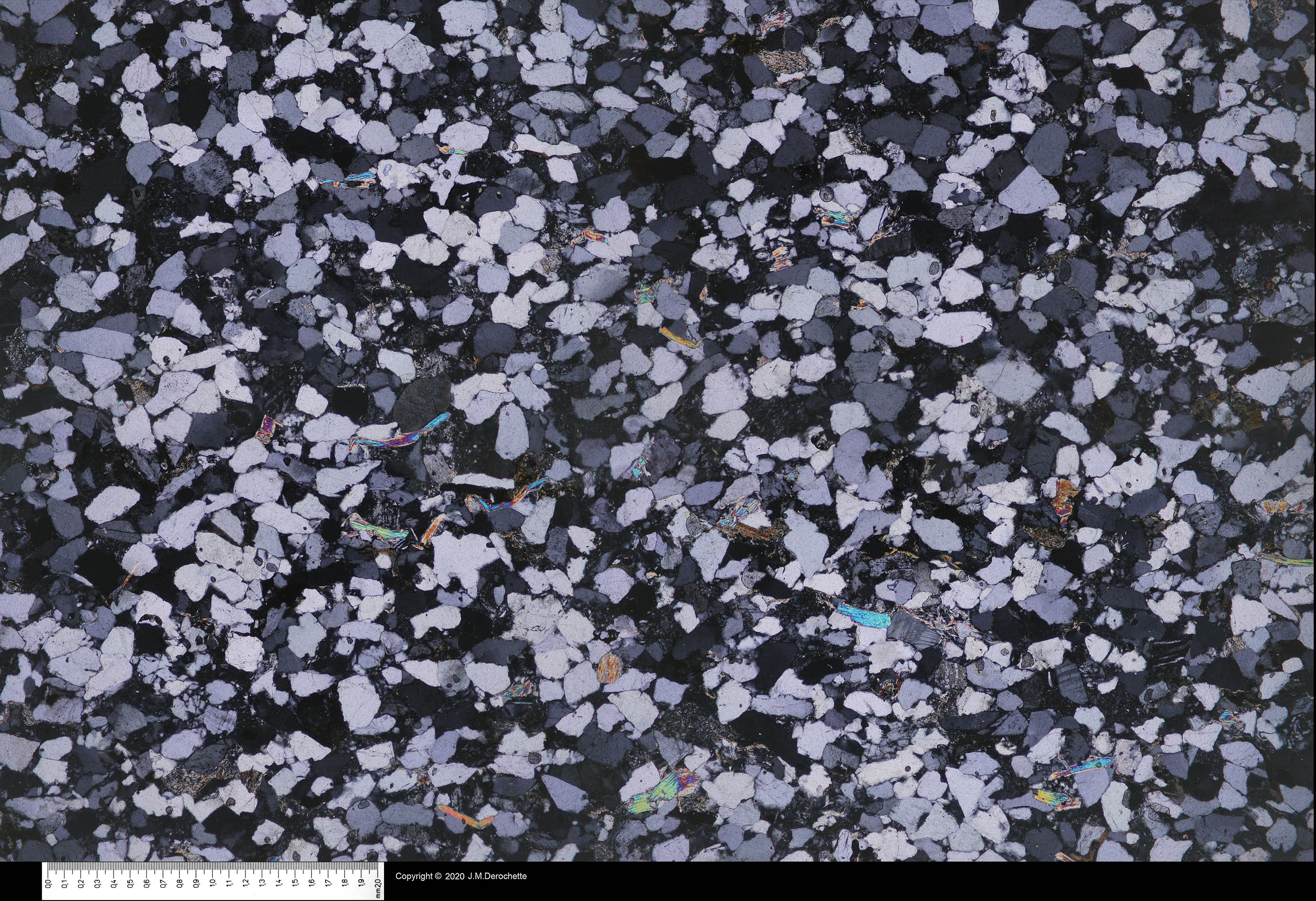 Arenite section between crossed polars. Quartz is the main mineral. Feldspars and rock fragments are also present. A few high birefringence micas can also be seen.