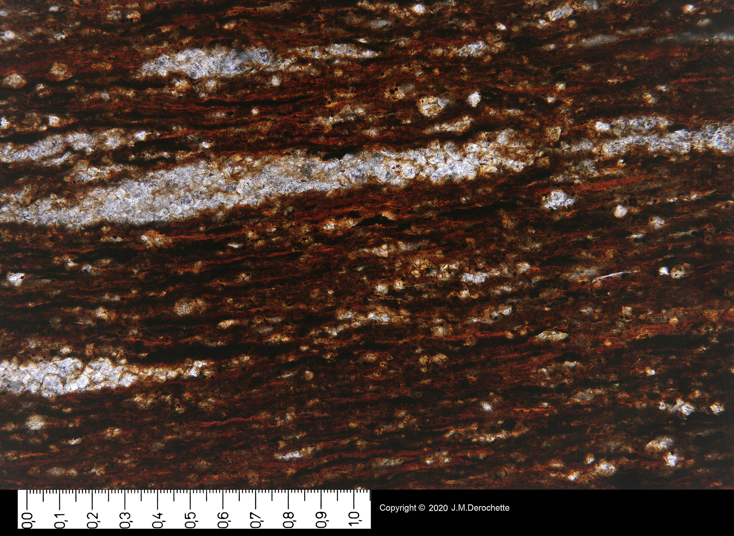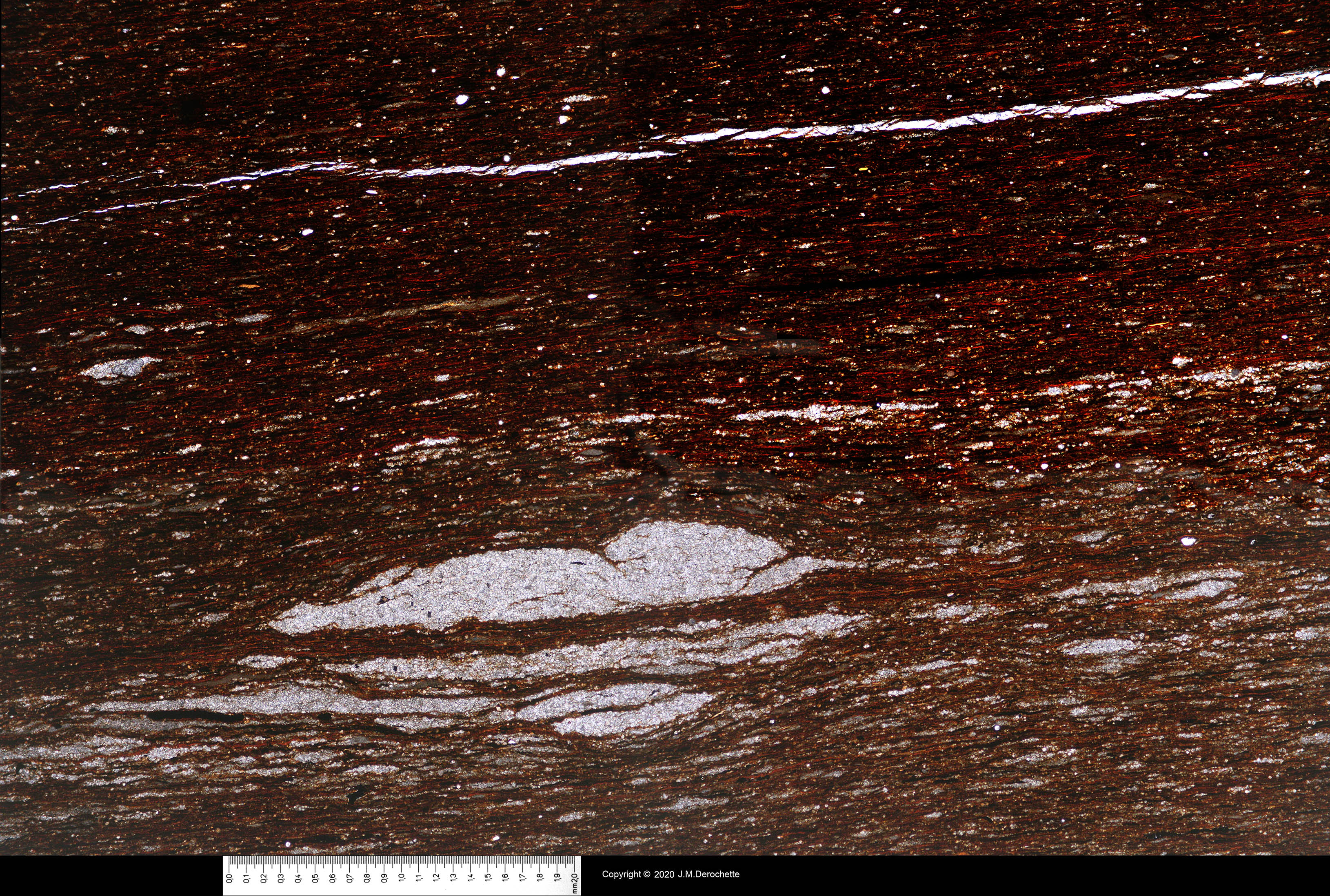 Layered shale section with a high content of organic material. Some fine grains quartz areas are also visible. The organics present between the sheets can give schist gas or petroleum.